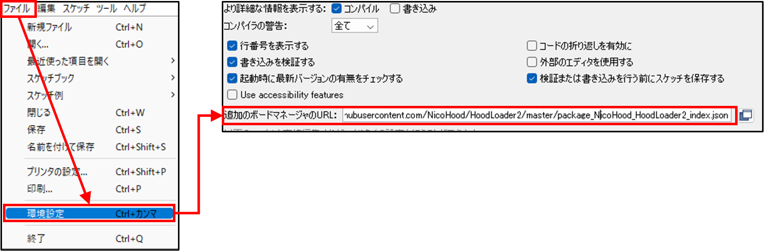 Arduino IDEを起動後、「環境設定」を開き「追加のボードマネージャ」を設定します。