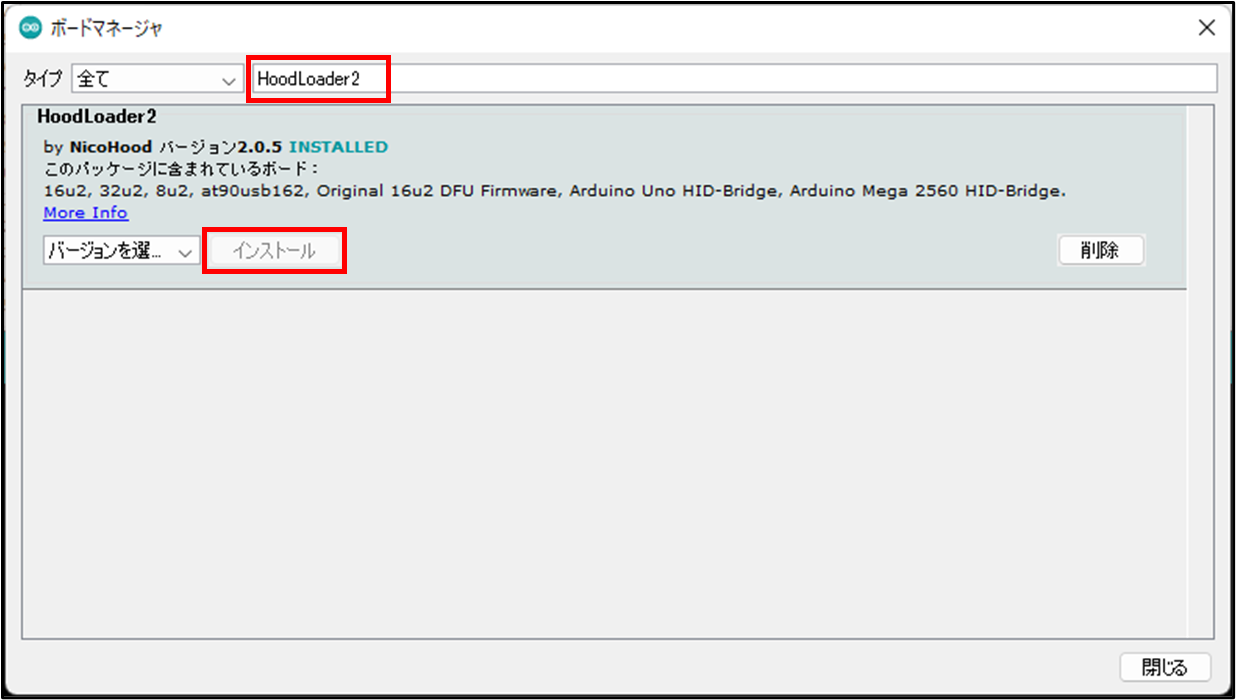 ボードマネージャウィンドウで「HoodLoader2」と入力して、最新版のボードをインストールします。